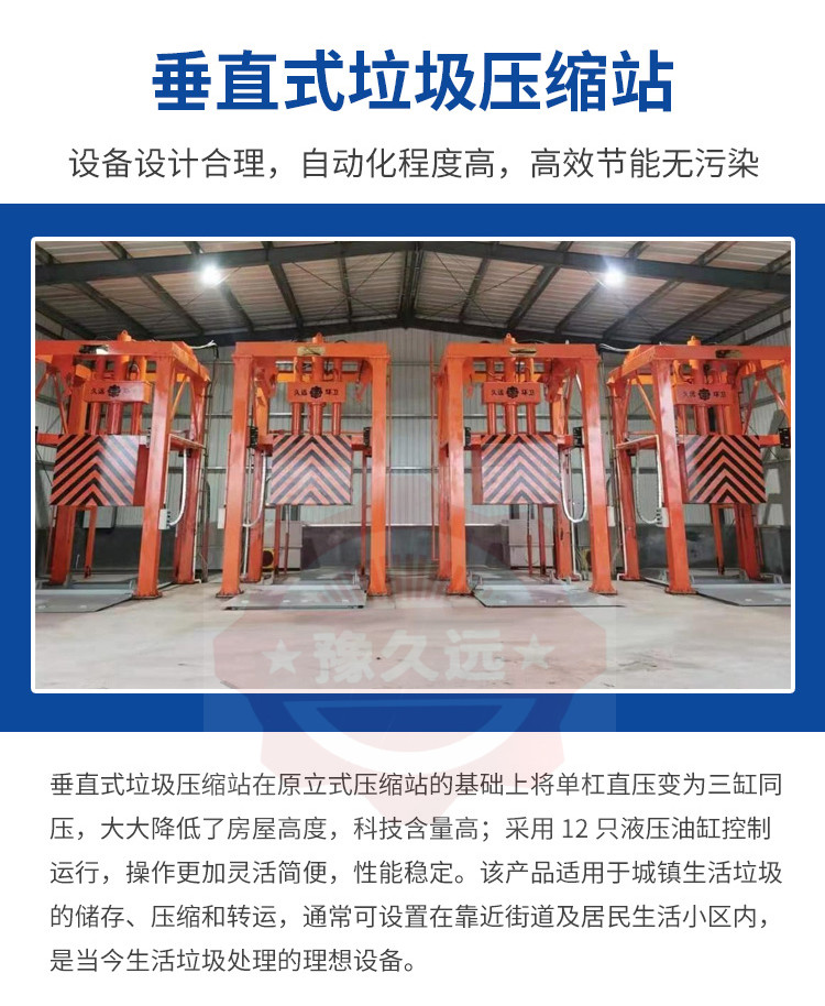 垂直式垃圾壓縮設備在原立式壓縮站的基礎上將單杠直壓變為三缸同壓,大大降低了房屋高度,科技含量高;采用12只液壓油缸控制運行,操作更加靈活簡便,性能穩定。該產品適用于城鎮生活垃圾的儲存、壓縮和轉運,通常可設置在靠近街道及居民生活小區內,是當今生活垃圾處理的理想設備。