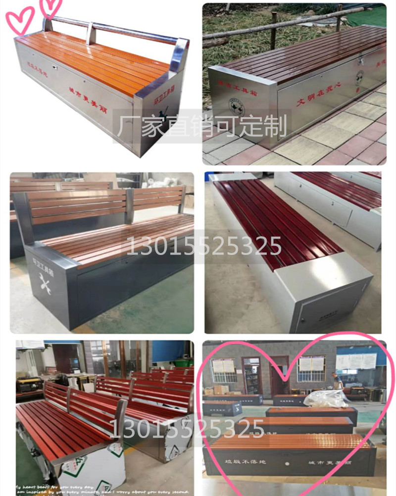 環(huán)衛(wèi)工具箱:也叫保潔員工具箱,環(huán)衛(wèi)工具椅,保潔員休息座椅,市政保潔箱等。工具箱常用尺寸為:長2400*寬500*高550mm,也可以做成2米,2.4米,2.7米等,寬度和高度也可以定做,滿足不同客戶、不同場所的使用要求。